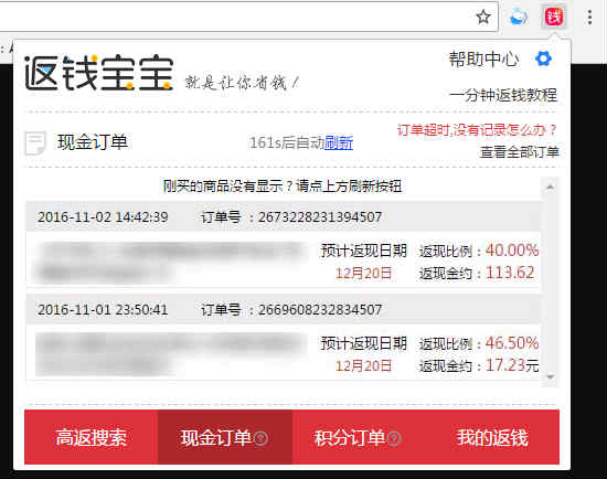 付款后才可以查询到返利订单!请在完成付款后点击右上角返钱宝宝图标
