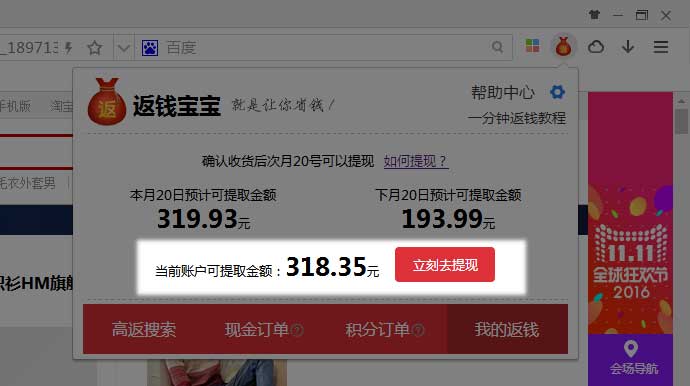 点击 我要返钱,在弹出的登陆页面登陆您的淘宝账号,即可进入返钱模式(初次使用可能需要身份验证,点击查看身份验证流程)